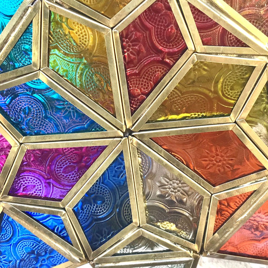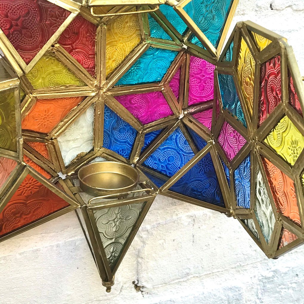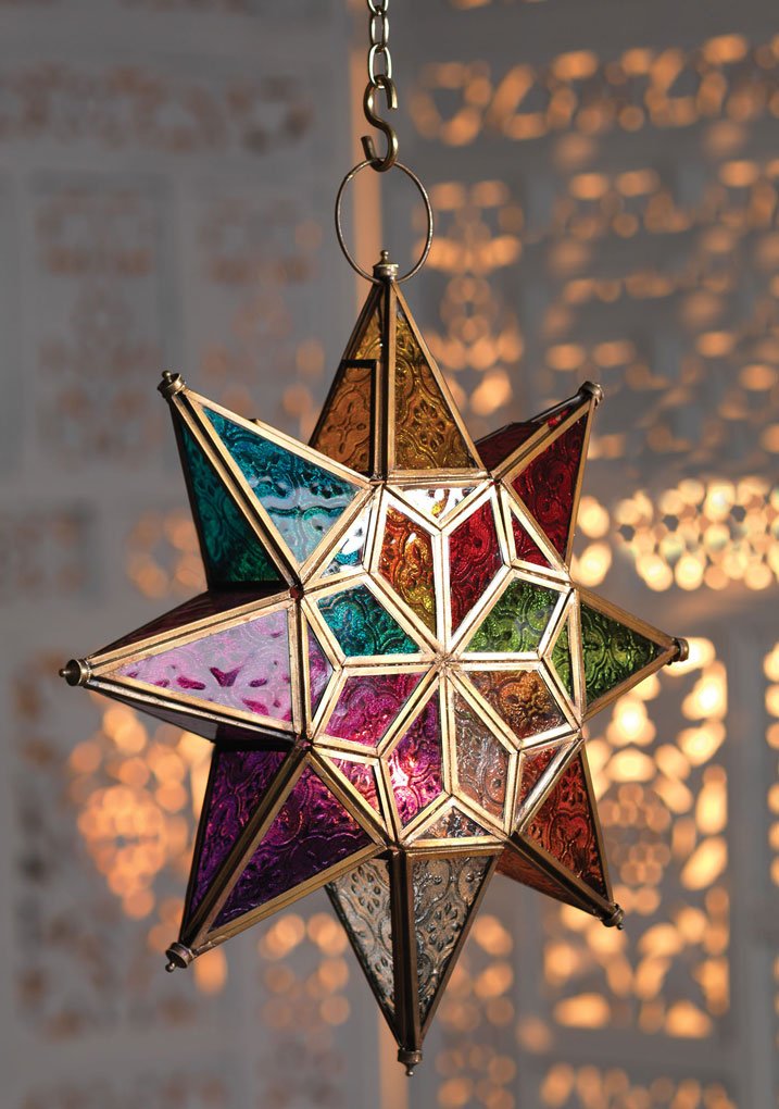 This stunning hand crafted metal work & glass Moroccan style star lantern glows an array of rich & lustrous colours that will instantly catch your eye & add atmosphere to any room or garden. Each Lantern is assembled by hand by skilled artisans in a small workshop in Northern India on a Fair Trade basis, who often pass their skills from generation to generation.