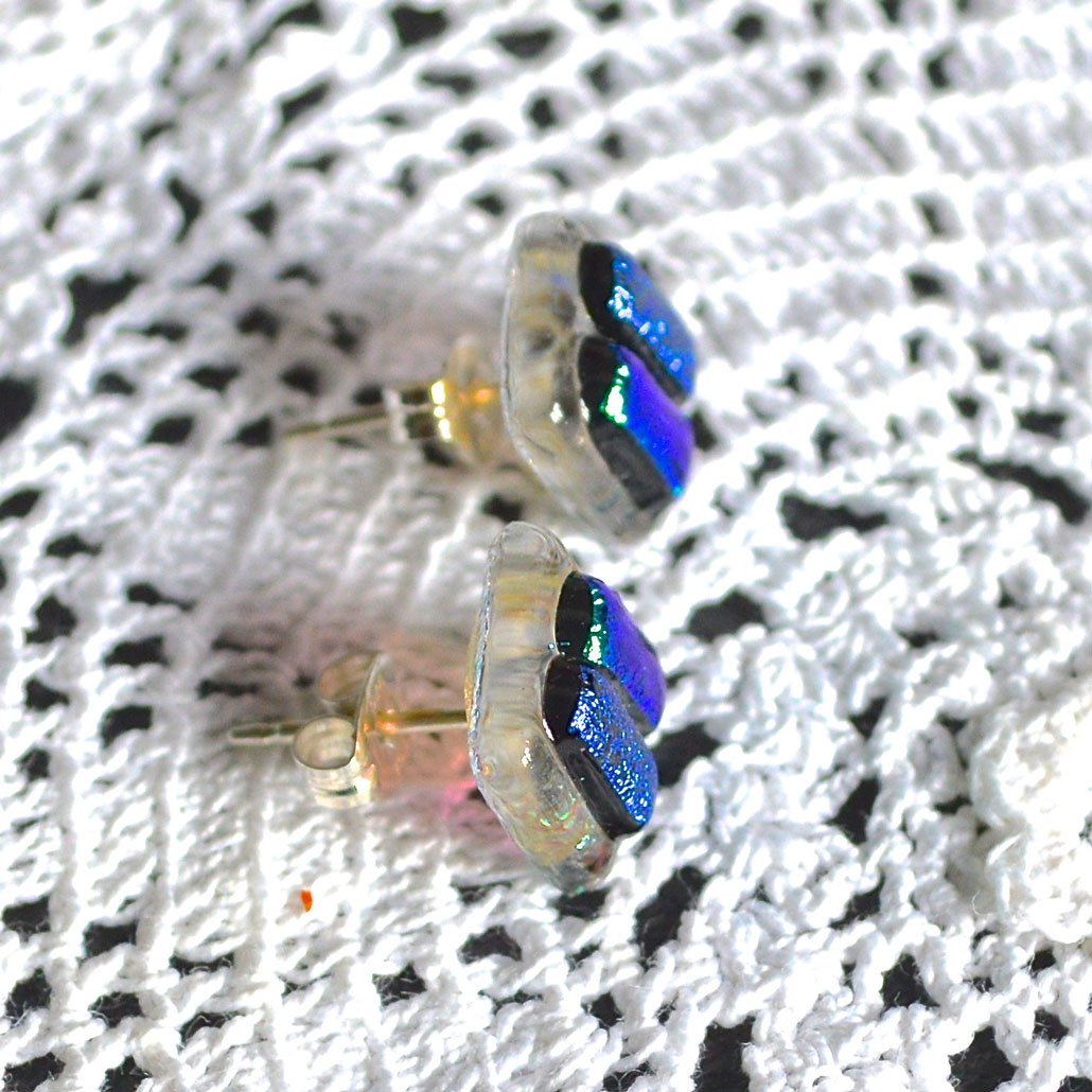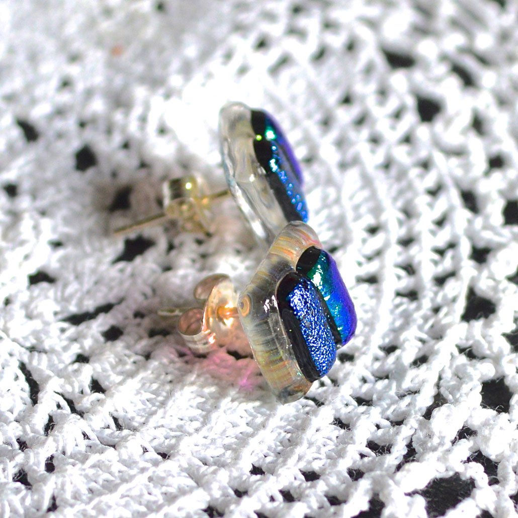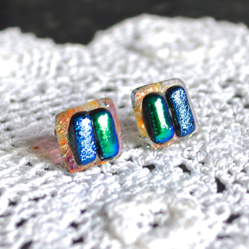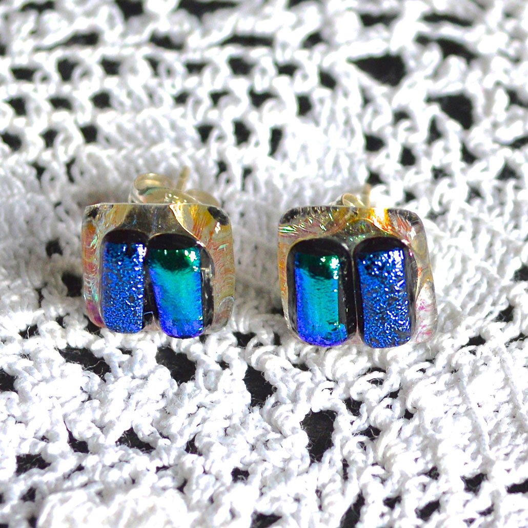 Fused dichroic glass stud earrings on sterling silver posts.