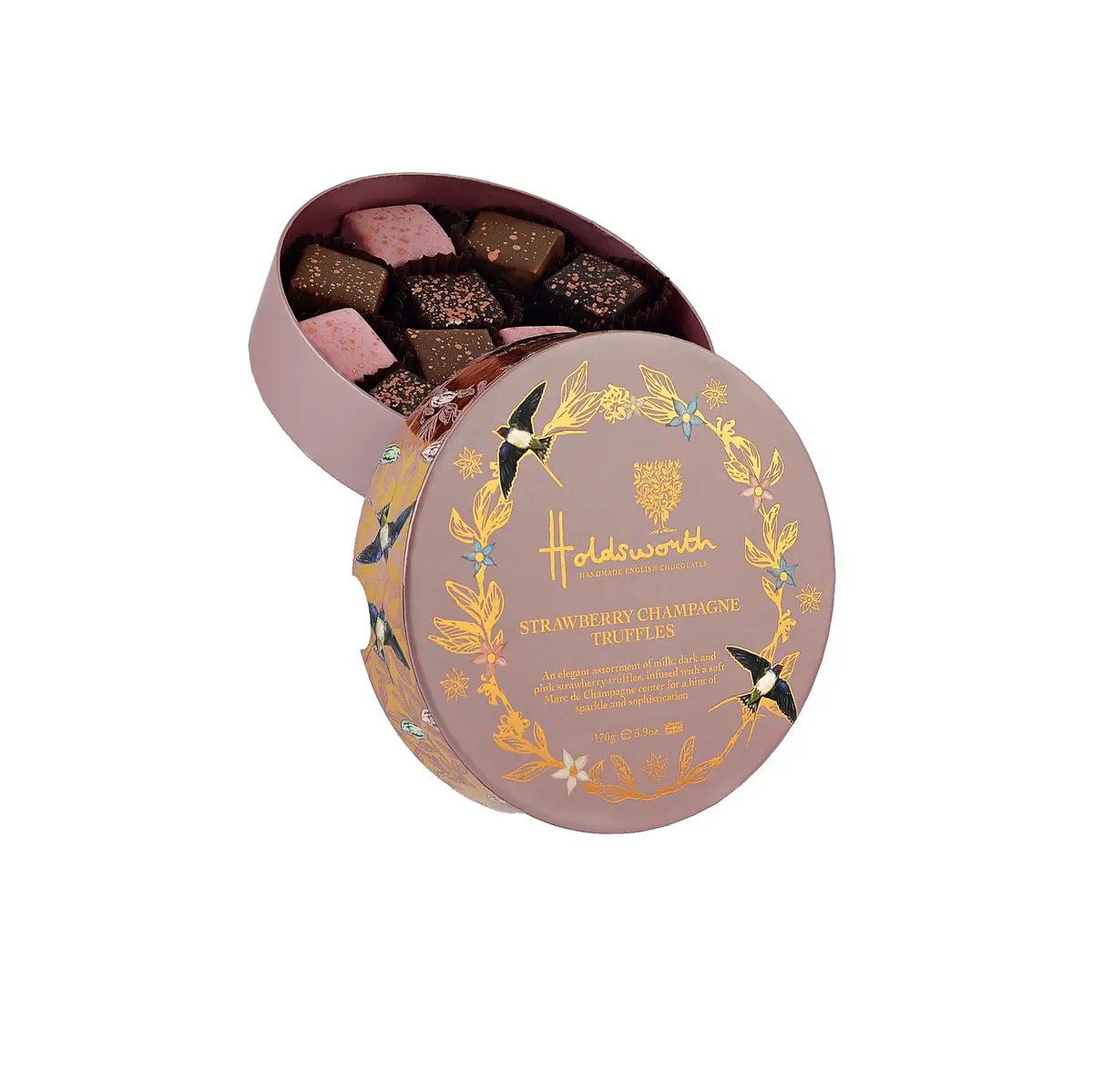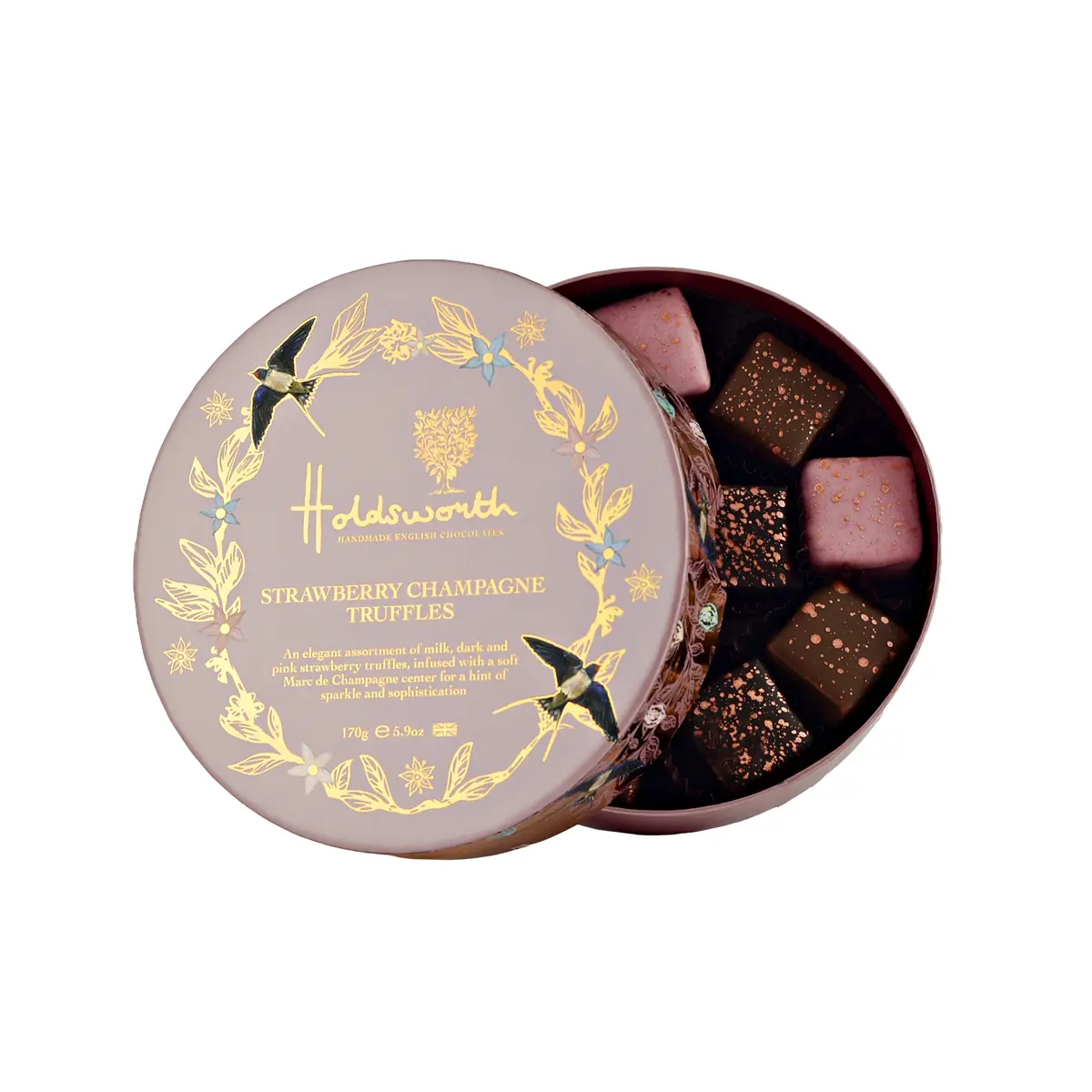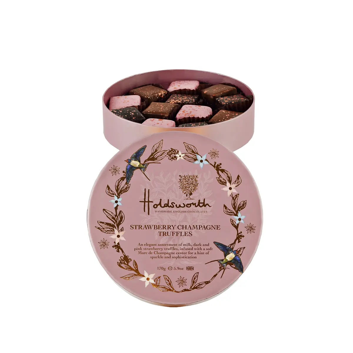 Presented in a beautifully designed round gift box, these truffles are not just a treat but an experience, a true celebration in every bite. Whether you’re looking to impress with a thoughtful gift or simply indulge yourself, Holdsworth’s Strawberry & Champagne Truffles promise to transport you to a world of opulence and delight. Perfect for any occasion, each truffle invites you to savour the exquisite craftsmanship and passion that has defined Holdsworth Chocolates for over 35 years. Enjoy a taste of luxury today.