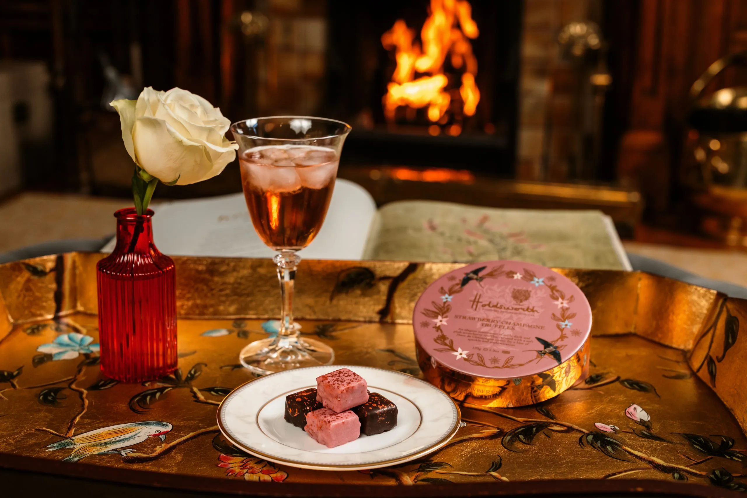 Sweet strawberry ganache truffles, infused with Marc de Champagne & enrobed in milk, dark & pink chocolate