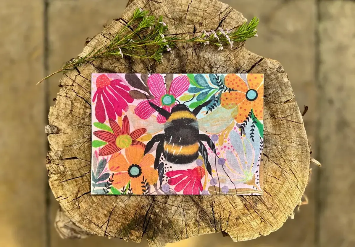 Vibrant Floral Bumble Bee Plantable Seed Paper Card by Erika's Whimsical Art is a celebration of life, colour, and nature. Part of a strikingly vivid collection, this design features a charming bumble bee nestled among an energetic floral arrangement, offering a thoughtful message that grows into a living meadow.